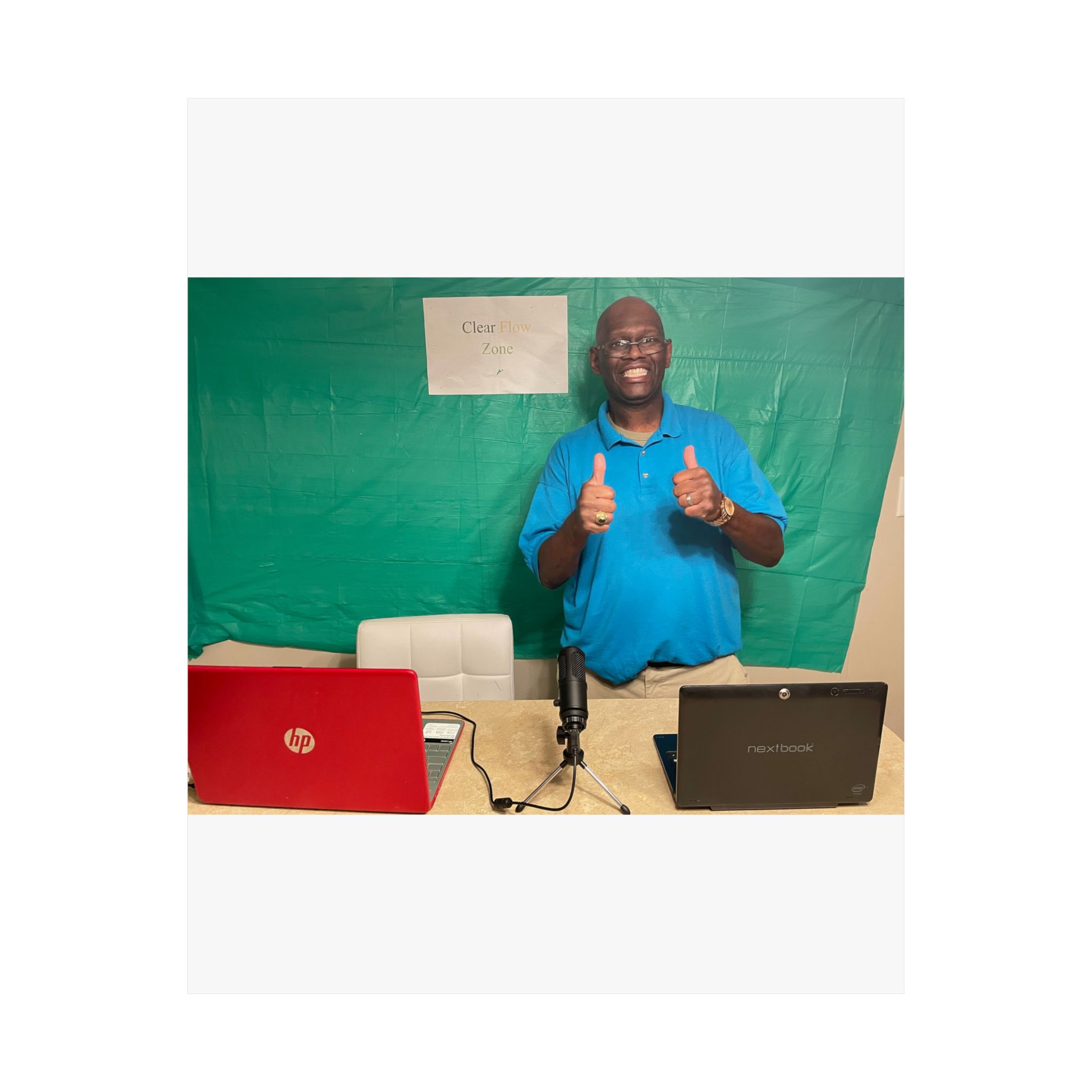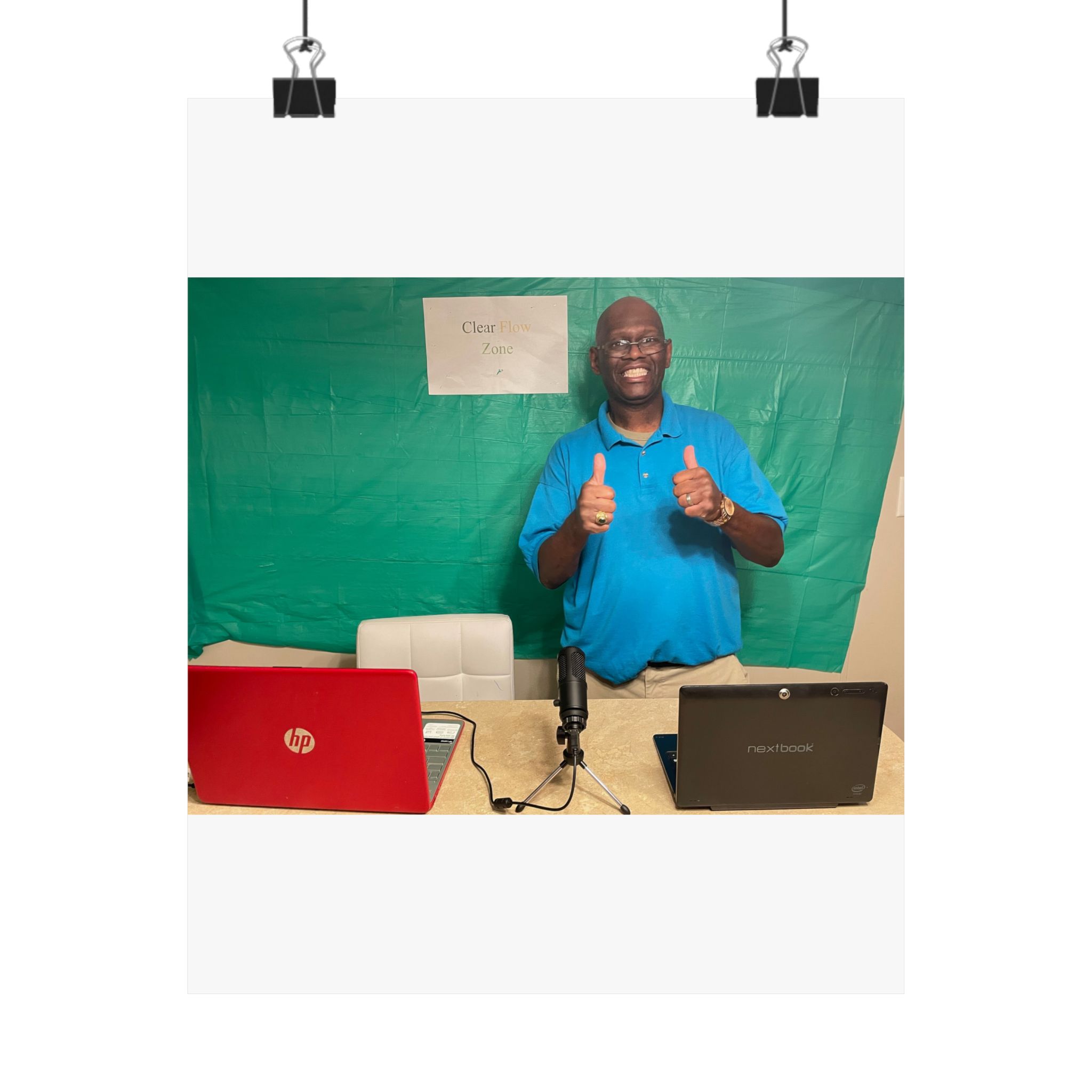A matte vertical poster printed on archival museum-grade paper that brings a warm, personal moment into your space. The image captures a joyful scene — a smiling host giving two thumbs up between two laptops and a microphone, set against a simple green backdrop. The matte finish reduces glare and gives the colors a soft, natural look while preserving bright, lasting tones thanks to high-quality giclée printing. Lightweight yet durable, this poster fits a variety of interiors: hang it in a home office, studio, or common area to inject everyday optimism and a reminder of friendly, human connection. With many size options and careful production standards, it’s designed to stay visually strong over time for indoor display.